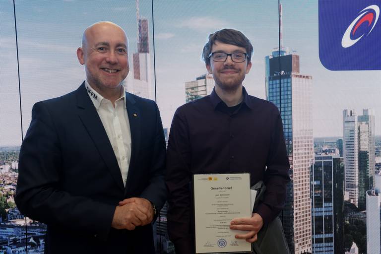 Manchmal gibt das Leben die Richtung vor. Etwa bei Leon Schenester, der schon als Schüler großes Interesse an Mathe und Physik zeigte und dann über einen Freund der Familie zur Elektronik kam. Ob die Details seiner künftigen Karriere wohl damals bereits vorgezeichnet waren? Seine Ausbildung hat er jedenfalls erfolgreich gemeistert. Nun hat er sein nächstes Ziel fest im Blick: den Meister-Titel. Mit viel Rückenwind blicken Leon und die anderen Gesellinnen und Gesellen optimistisch in ihre berufliche Zukunft. Am 1. April wurden sie bei der Freisprechungsfeier der Innung für elektro- und informationstechnische Handwerke Frankfurt freigesprochen.